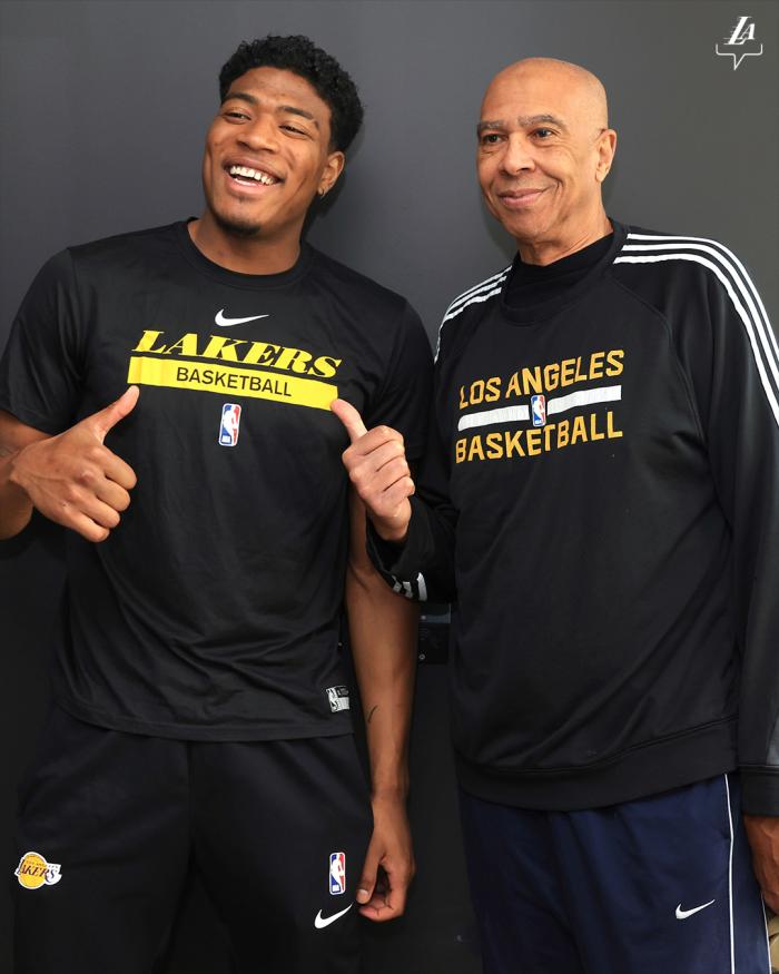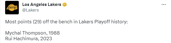 湖人G1赢球的大功臣之一是八村垒,替补上场29分钟,14投11中、三分6中5拿到29分6篮板1助攻,G1得分排在全队第一;今日湖人官方晒出八村垒和迈克尔-汤普森(汤普森的父亲)的合影,配文写道:湖人队史季后赛替补最高得分,1988年的迈克尔-汤普森和2023年的八村垒。