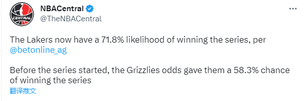 在湖人和灰熊系列赛开打之前,外网大数据网站预测湖人的晋级概率为41.7%,灰熊晋级概率为58.3%;系列赛第一场打完,湖人以下克上掀翻联盟第二取得季后赛开门红,总分1-0领先后外网大数据网站预测,湖人晋级西部半决赛的概率飙升到71.8%。
