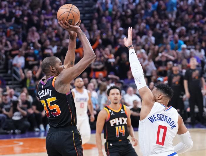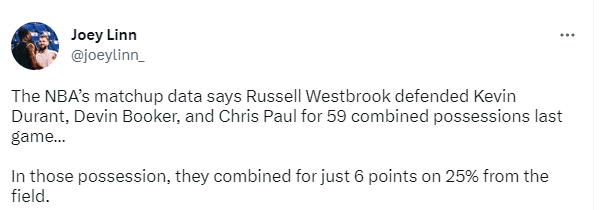 24直播网04月18日,快船和太阳系列赛G1,威少防守太阳三巨头的数据出炉,据统计,威少防守杜兰特、布克和保罗59个回合,仅仅让他们拿到6分,BCD投篮命中率仅仅只有25%。