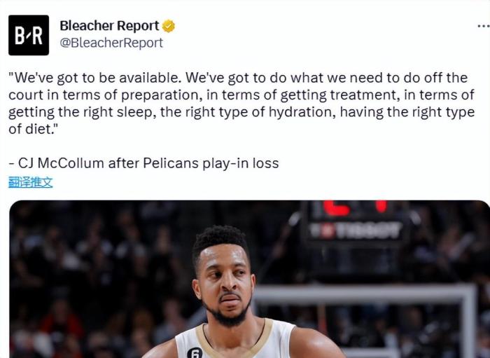 除此之外,老将CJ麦科勒姆也罕见地批评队友。这位新闻系高材生,一反常态地将矛头对准锡安:“我们需要我们最好的球员在场上,尤其是在有意义的比赛里,为了在季后赛取得真正的突破,我们必须这样做。”此外,CJ还表示:“我们必须保证出勤率,在场外做我们需要做的事情,包括赛前准备、接受治疗、获得正确的睡眠、正确的补水方式、正确的饮食类型。”很显然,CJ是在暗讽锡安。