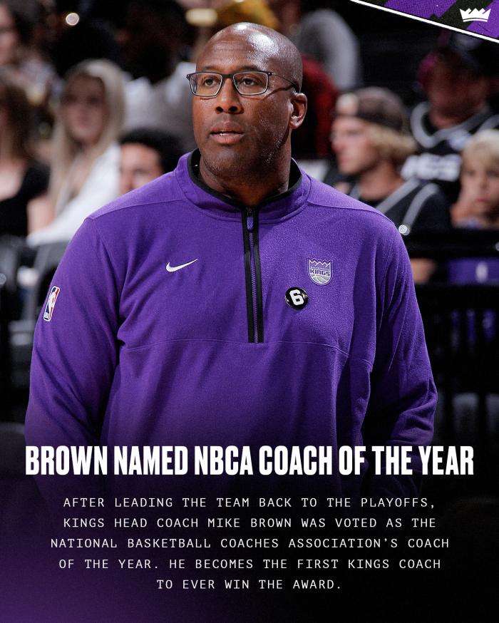 国王官方祝贺布朗,发推写道:NBA今年2月份最佳主帅,带领国王进入季后赛,太平洋赛区冠军,NBCA年度最佳主帅,NBA年度最佳主帅也快了,恭喜主帅。