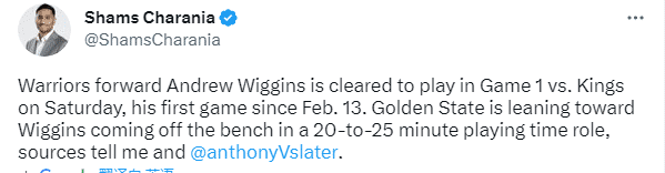 据名记shams透露,勇士计划让维金斯替补出战,预计上场20-25分钟。