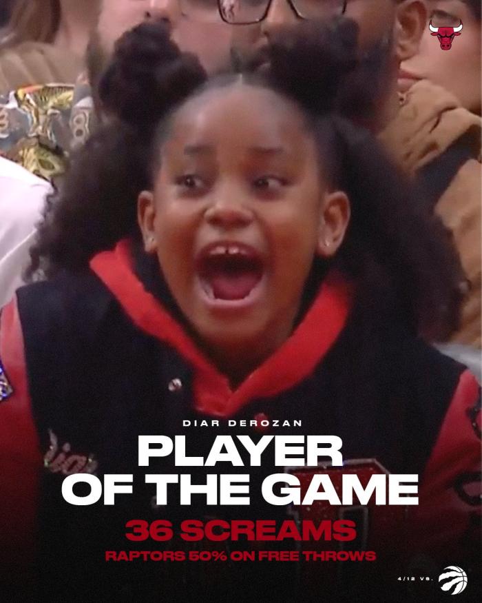 24直播网04月14日讯 公牛附加赛客场19分逆转送猛龙回家,德罗赞的女儿迪亚尔-德罗赞火遍全网,她的一招“狮吼神功”助公牛拿下关键一战,在德罗赞女儿尖叫声的干扰下,猛龙全队36罚18中,足足罚丢18球,赛后迪亚尔被称赞为本场比赛真正的MVP。