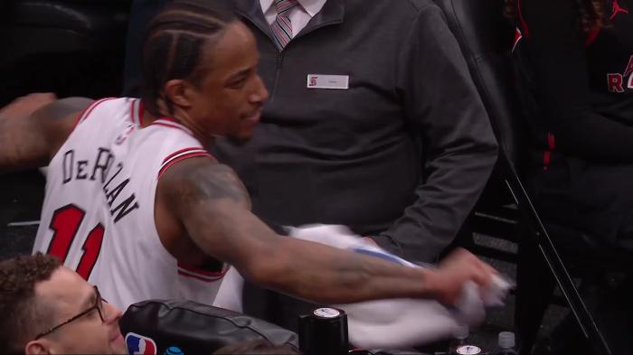 下半场,公牛第三节被打3-10瞬间落后到18分,3分40多秒,德罗赞中投打铁,之后抢篮板撞倒范弗利特吃到犯规,德罗赞十分沮丧和生气,坐回替补席后他撕烂毛巾泄愤,一怒之下直接把毛巾撕成两半。
