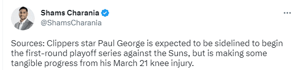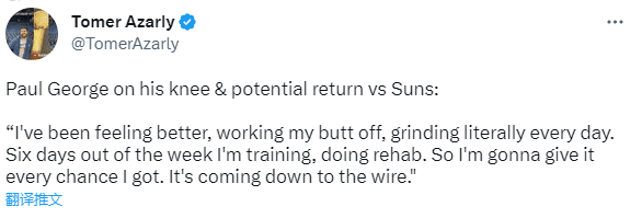 据名记shams报道,乔治的膝伤恢复取得了一些明显的进展,预计将缺席季后赛首轮的开始阶段;shams还在节目中表示如果快船想要有个机会让乔治回归的话,那么他们将不得不在没有他的情况下击败太阳;究竟乔治能否赶上季后赛首轮?拭目以待吧。