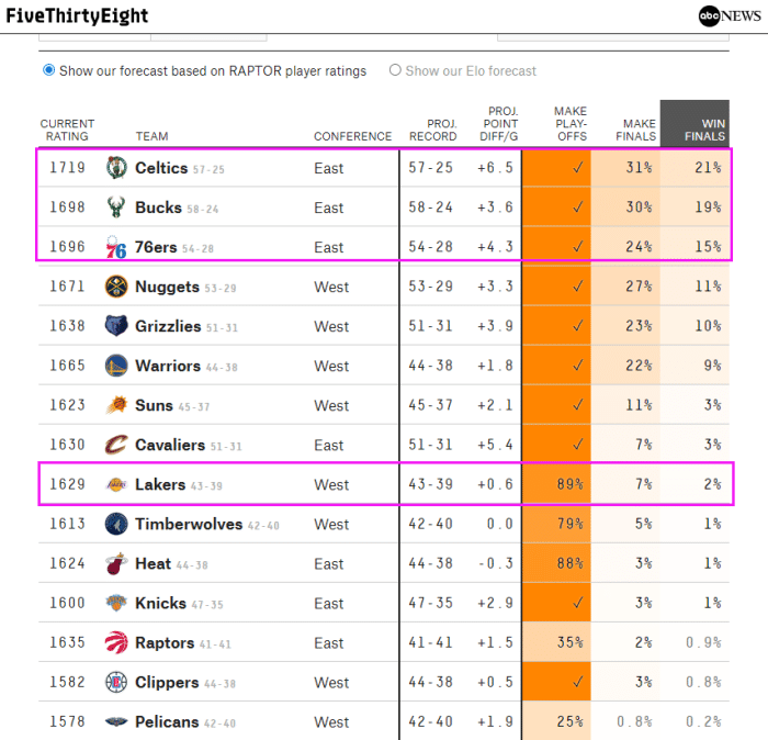 根据权威网站FiveThirtyEight最新预测,凯尔特人夺冠概率21%联盟第一,雄鹿19%紧随其后,76人15%、掘金11%和灰熊10%;勇士夺冠概率9%,太阳和骑士3%,湖人晋级季后赛的概率为89%,夺冠概率仅2%。