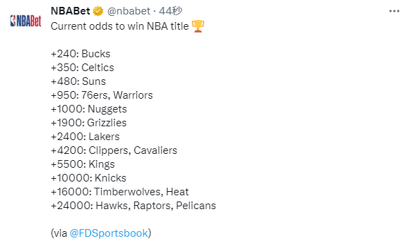 1、雄鹿+240;2、凯尔特人+350;3、太阳+480;4、76人和勇士并列+950;6、掘金+1000;7、灰熊1900;8、湖人+2400;9、快船和骑士并列+4200;之后国王+5500、尼克斯+10000、森林狼和热火+16000、老鹰猛龙和鹈鹕+24000