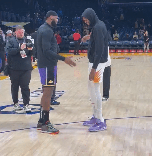 杜兰特投篮热身时,詹姆斯路过并且主动走过来,先是和杜兰特击掌,然后两人紧紧拥抱,詹杜两人尽情热聊,两人聊得很开心,再次拥抱后詹姆斯走开,杜兰特满脸笑容十分开心。
