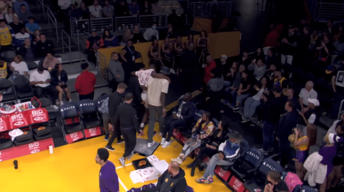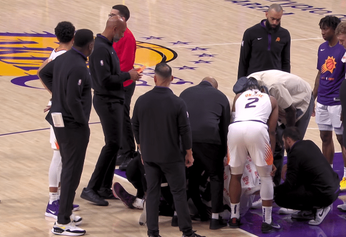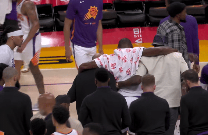 24直播网04月08日讯 ,在太阳和湖人比赛中,太阳遭重创,比永博被浓眉撞伤膝盖,痛苦倒地不起,表情痛苦,杜兰特等队友都十分担忧,之后比永博被搀扶离场返回更衣室。