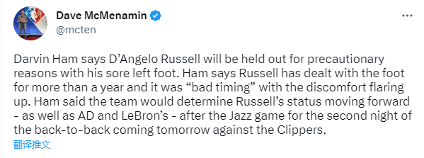 上一场拉塞尔因左脚酸痛提前退出比赛,如今天对阵爵士,拉塞尔的出战状态从大概率降级为出战成疑,随后哈姆宣布拉塞尔缺席比赛。
