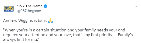 24直播网04月05日讯 ,安德鲁-维金斯正式归队,时隔49天终于露脸,维金斯回应回归:永远把家庭放在第一位;维金斯感谢众人,相信很快就能复出。