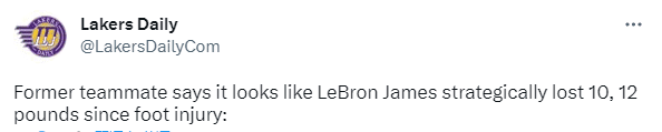 值得一提的是,据詹姆斯前队友理查德-杰弗森爆料,自从詹姆斯右脚受伤后,老詹战略性减重10-12磅(大概9-11斤),从而减轻受伤那只脚的重量,让自己变得更轻更快。