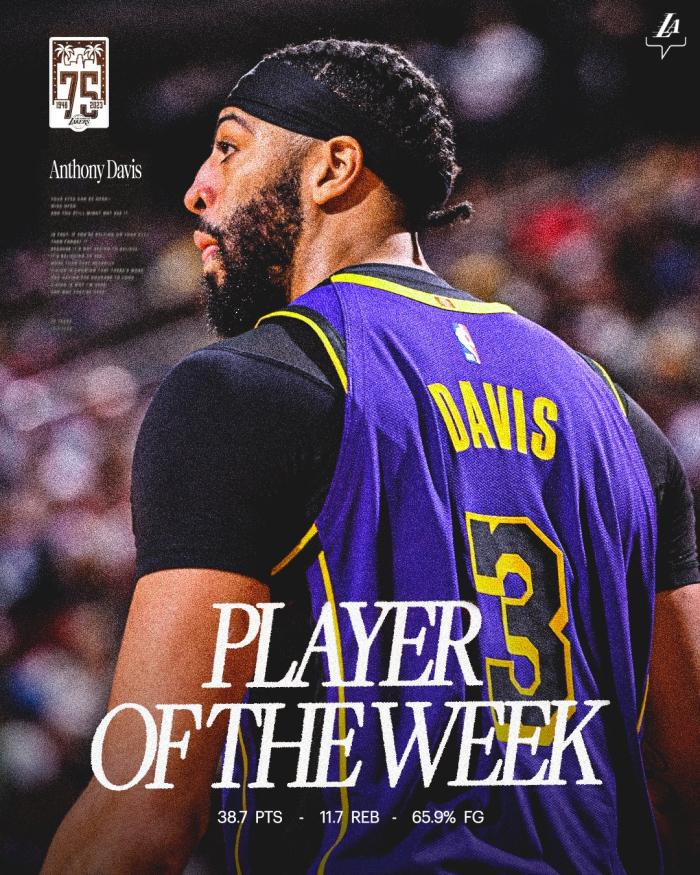 凭借上周场均轰下38.7分11.7篮板的统治级表现以及带领湖人3胜0负,浓眉力压杜兰特、布克、库里等人夺得西部周最佳球员,这是浓眉生涯第9次和湖人生涯第4次获此殊荣,湖人官方祝贺浓眉。