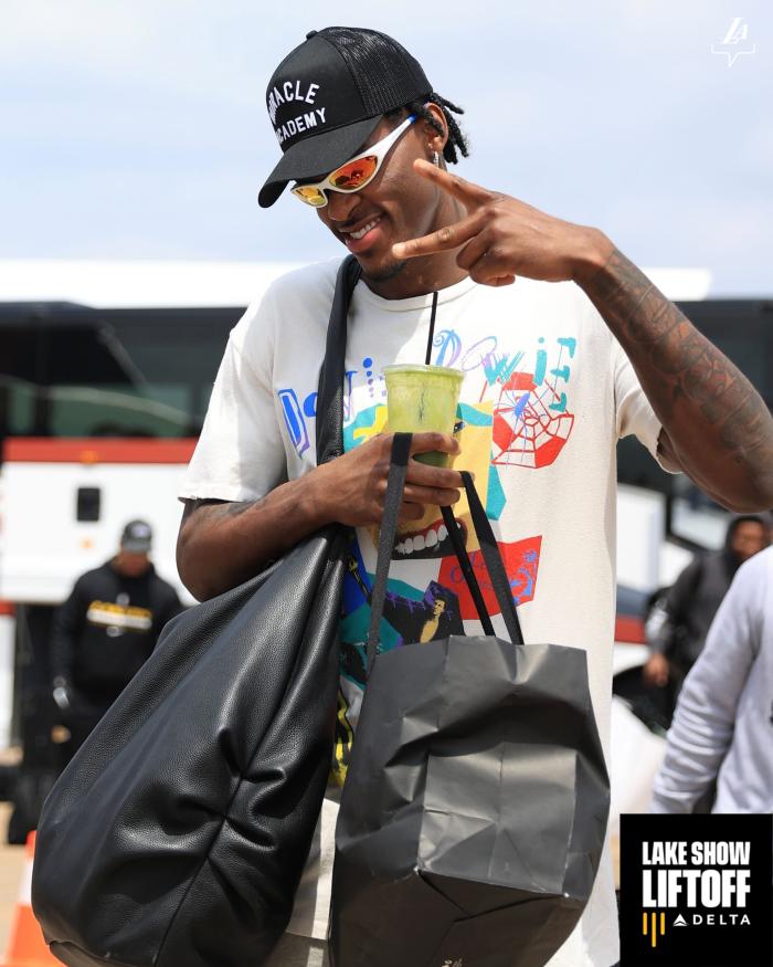 湖人官方还晒出拉塞尔、范德比尔特、朗尼-沃克等人的登机照,彪哥一身打扮很潮流,拿着饮料并且提着大包小包冲镜头比V。
