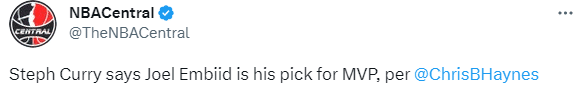 库里解释:无论你选择哪一位,他们的表现都可以和约基奇、字母哥相提并论;但我想很多人都没有想到恩比德的表现能有这样的飞跃,因为他已经早早地统治着联盟了。他的这一飞跃吸引到了人们的注意,也让76人处于一个很好的位置上。如果我要选的话,我会选他。