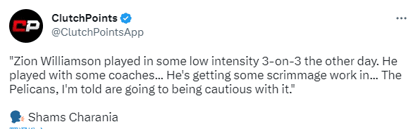 名记shams在节目中表示:锡安前几天打了一些低强度的3对3训练,他和一些教练一起打球,正在接受训练,我被告知鹈鹕会对此保持谨慎。