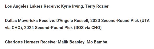 独行侠得到:拉塞尔、黄蜂的两个次轮签(2023年来自爵士,2024年来自绿军)