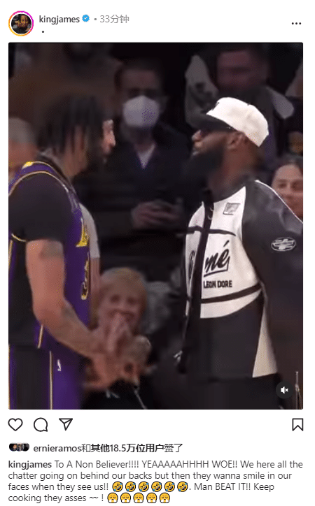 詹姆斯在INS上晒出与浓眉庆祝一幕,配文写道:致质疑者!没错,叹气吧!我们就在这里,有人在背后喋喋不休,但当他们看到我们时,却想对我们当面微笑!打败它吧!继续打爆他们的屁股吧。