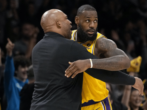 在湖人对阵太阳比赛期间,第三节布克罚球时,詹姆斯指着球场认真指导浓眉;詹姆斯还耐心指导克里斯蒂;暂停期间,詹姆斯忍不住上场练球,身穿便装戴着墨镜仍上场运球,可能是裤子太紧了,老詹胯下运球时砸腿失误。