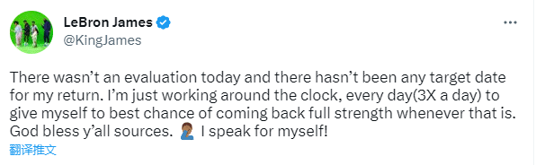 究竟詹姆斯何时能够复出?多位名记报道詹姆斯有望在常规赛结束前3-4场复出,詹姆斯本人公开驳斥并直言他没有任何复出的目标日期;发推写道:今天我没接受评估,目前我也没有任何复出的目标日期。我只是日以继夜地工作,每天进行三次训练,让自己获得彻底康复的最佳机会。上帝保佑所有那些消息源。我为自己发声!