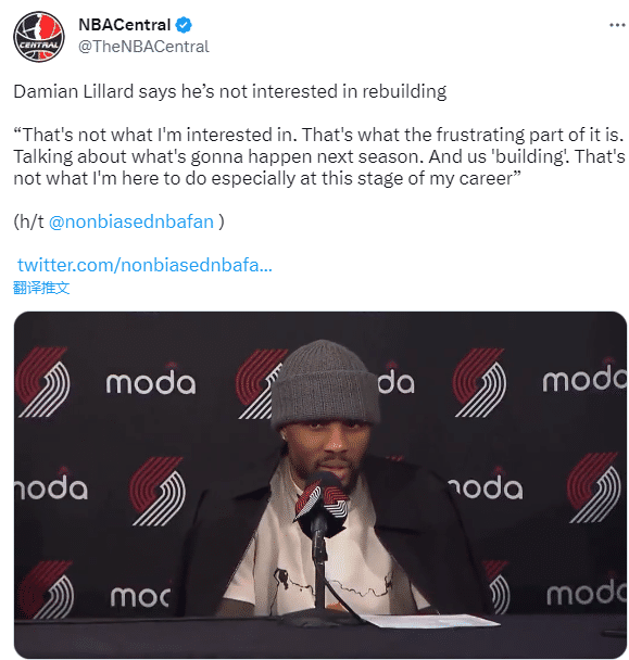 开拓者球星利拉德接受采访时表示,他对重建不感兴趣:这不是我感兴趣的。这就是令人沮丧的部分。谈论下赛季会发生什么以及我们的‘重建’。那不是我在这儿的目的,尤其是在我职业生涯的这个阶段。