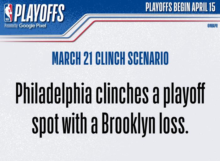 76人48胜23负排在东部第三位,正式并且提前11场锁定一个季后赛席位,成为东部第三支和联盟第四支晋级季后赛的球队,连续6年晋级季后赛。
