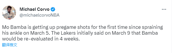 据湖人队记Michael Corvo报道,班巴在脚踝扭伤后首次参加赛前投篮训练,这是班巴回归的一大利好;在此前对阵勇士的比赛中,班巴不幸崴脚伤退,检查之后,湖人宣布班巴左脚踝扭伤,4周内复查;养伤期间班巴坐在替补席观战,早就渴望重返赛场。