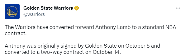 24直播网03月18日讯 ,勇士官方正式宣布与安东尼-兰姆签下一份NBA标准合同,兰姆终于转正从而获得出战季后赛的资格,勇士官宣和基诺内斯签下双向合同,勇士15+2卫冕阵容出炉,库里汤普森领衔。