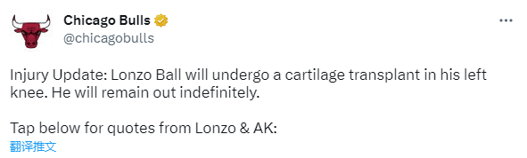 公牛篮球运动总裁Artúras Karnišovas表示:我对朗佐-鲍尔在整个过程中表现的毅力表示钦,对他来说,这是一条漫长而充满挑战的道路,做出这个决定也是一个艰难的决定。球队会全力支持他,我们的训练和医疗人员将继续致力于朗佐的康复,并在下一阶段与他合作,确保他健康回归赛场。
