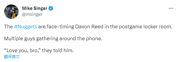 据掘金记者Mike Singer报道,掘金赢球赛后众球员给前队友达文-里德(目前里德为湖人效力,交易截止日前被掘金送到洛杉矶)打视频电话,集体高呼:爱你,兄弟。