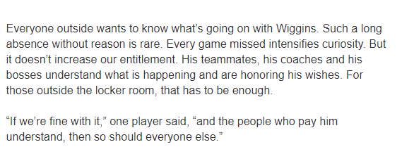 究竟维金斯遭遇了什么事?据记者Marcus Thompson II报道,一位匿名的勇士球员在评价到威金斯长期缺阵时说:他目前正在处理的,是一些真正的咒骂(expletive);该记者还透露大家都非常尊重维金斯的隐私,在勇士更衣室中,大家都理解维金斯以及耐心等待他回归,没有球员在背后窃窃私语,没有人抱怨,维金斯的队友、老板和教练都理解并尊重维金斯的意愿。