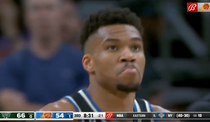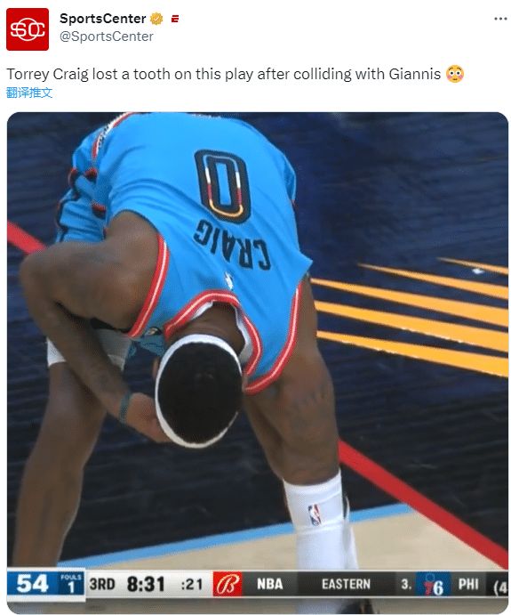 第三节8分多钟,字母哥进攻时肘击到克雷格的面部,直接把后者的牙齿打掉了,克雷格倒地,然后从地上捡起牙齿碎片,坚持打了一会后返回更衣室接受检查,之后克雷格坐回替补席;字母这一铁肘太狠了,美媒纷纷转发如此一幕。
