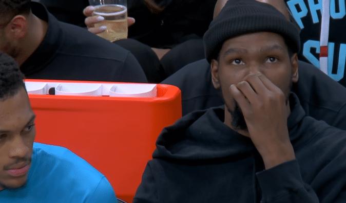 值得一提的是,杜兰特坐在替补席观战,蒙蒂透露KD正接受全天候治疗;此前杜兰特在赛前热身时不幸扭伤脚踝,暂无具体复出时间。