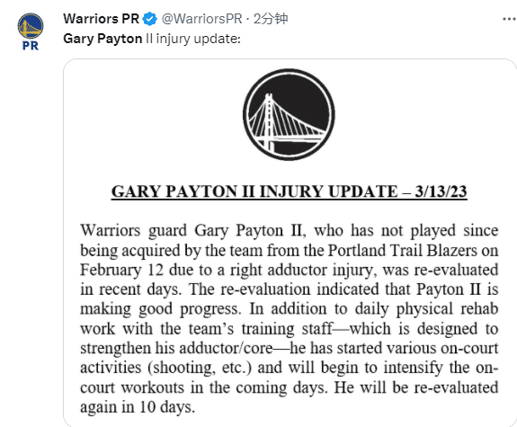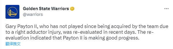24直播网03月14日讯 ,勇士迎来好消息,勇士官方表示,佩顿最近接受了重新评估,表明他正在取得良好的进展,除了和球队训练人员一起进行日常的身体康复训练——旨在加强他的内收肌/核心肌群——之外,他已经开始进行各种场上活动(投篮等),并会在未来数天开始加强场上训练,他将10天内接受复查,换言之,小佩顿最快有望10天后回归。
