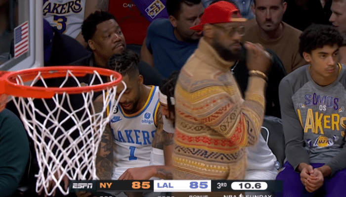 拉塞尔三节14投12中轰下31分,湖人官方盛赞他是火焰喷射器;第三节期间,拉塞尔和浓眉坐在替补席拿着平板研究录像,詹姆斯溜达一会后也和他们交流,之后拉塞尔起身走开,把座位还给詹姆斯。