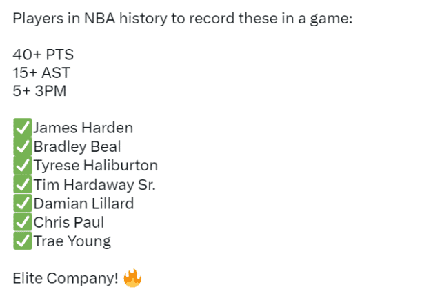 美媒数据显示,联盟历史上只有7名球员曾在一场比赛中同时做到得分40+,助攻15+,且投中至少5个三分。这7名球员就包括哈登和哈利伯顿,除了他们俩,还有比尔、蒂姆-哈达威、利拉德、保罗和特雷-杨。