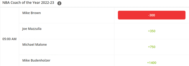 年度最佳主教练的最新赔率排名如下:1. 国王的布朗(-300)、2.凯尔特人的马祖拉(+350)、3.掘金的马龙(+750)、4.雄鹿的布登霍尔泽(+1400)。布朗目前的优势非常明显,国王的巨大进步,让他成为了头号热门。