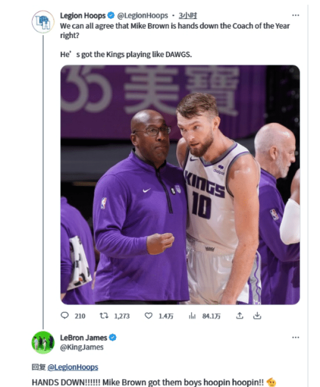 作为布朗昔日的弟子,湖人球星詹姆斯也在社媒上发声力挺。美媒Legion Hoops今日发推写道:“我们都同意迈克-布朗毫无疑问是年度最佳教练,对吧?他让国王队打得像狗(表示夸奖)一样!”詹姆斯在这条社媒下回复道:“毫无疑问!!!迈克-布朗带领这群男孩打得也太好了!!”