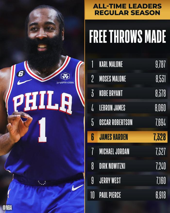 24直播网讯03月11日,76人主场21分逆转开拓者,哈登全场14投6中、三分8中2、罚球5中5拿到16分8助攻9篮板,哈登生涯罚球命中数正式超越乔丹,升到NBA历史罚球命中榜第六位;哈登关键三分给力,生死时刻夹手臂进攻犯规险葬送比赛,恩比德39分7篮板4助攻上演1.1秒绝杀。