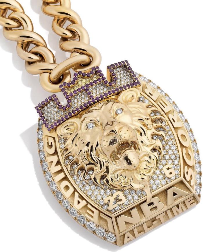 詹姆斯历史得分王项链,正面刻着詹姆斯专属的国王和狮头标志,镶满了白色和紫色钻石,上面还詹姆斯生涯穿过的23号与6号球衣号码以及NBA历史得分王字样。