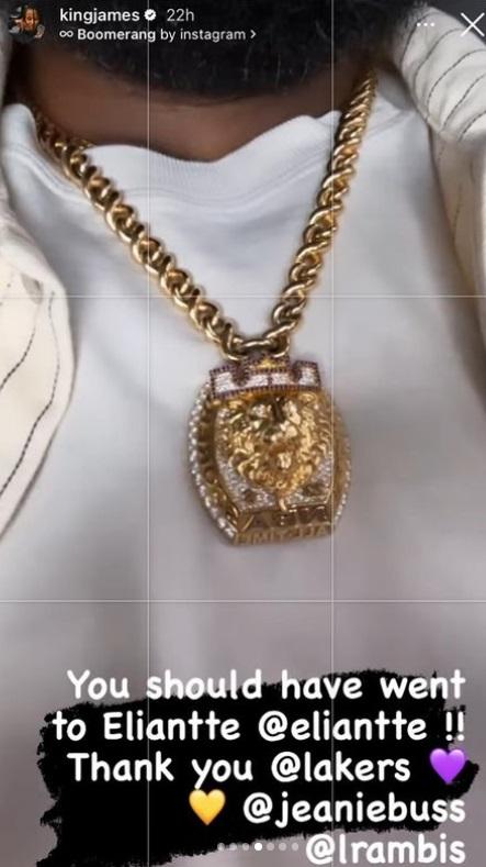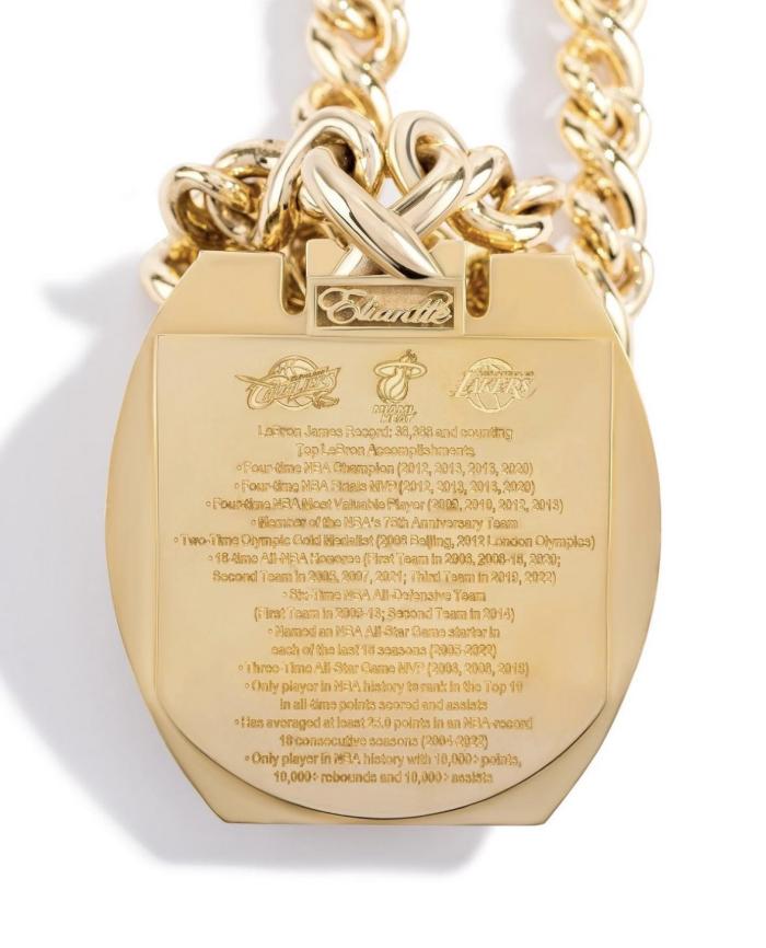 项链背面刻有詹姆斯生涯至今多项荣誉——38388分历史得分王、4届NBA总冠军、NBA总决赛MVP(2012;2013;2016;2020)、4届NBA常规赛MVP(2009;2010;2012;2013)、历史75大球星成员、2届奥运会金牌(2008,2012)、18届NBA最佳阵容详情、三次全明星赛MVP、史上第一位得分和助攻都排在历史前10的球员、连续18年场均得分25+、史上第一位达成10000分+10000篮板+10000助攻的球员。