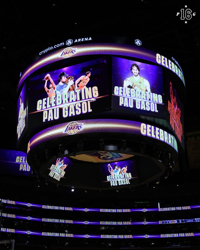 24直播网讯03月08日,湖人将在主场退役保罗-加索尔的16号球衣,赛前湖人在主场观众席布满了加索尔的16号球衣,现场大屏幕上写着祝贺保罗-加索尔;加索尔戴着两枚冠军戒指接受采访,直言这是非常特别的一天,因为他的球衣是在科比之后退役的。