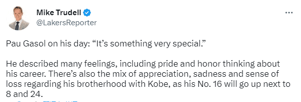 对于球衣退役,此前加索尔表示:我认为这是我生命中最重要的时刻获得退役球衣这一荣誉,并让我的球衣与那些曾获得难以置信成就的传奇人物并列,这是我之前从未想过的事情。