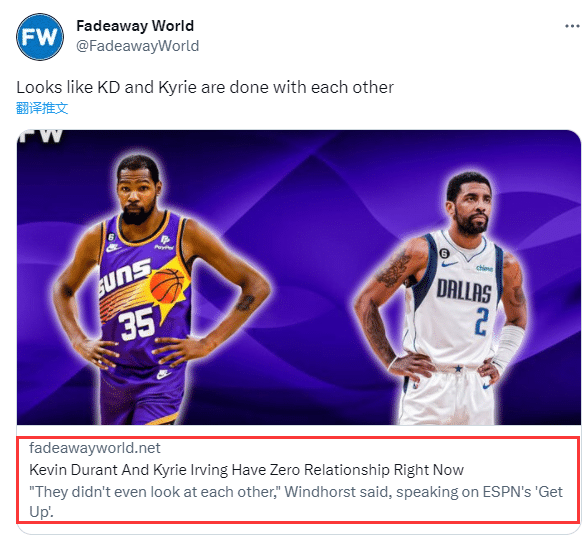 在太阳和独行侠的比赛中,正式跳球前,欧文上场时杜兰特偷瞄了欧文一眼;不过整场比赛,杜兰特和欧文之间确实几乎零交流,当欧文为东契奇抱不平,与布克争吵时,杜兰特双手掐腰看热闹,站在附近一言不发。