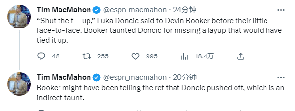 最终裁判吹罚布克和东契奇双双技术犯规;究竟东契奇和布克为何互喷?据ESPN名记Tim MacMahon报道,当时布克嘲讽东契奇上空篮不进,然后东契奇冲着布克爆粗口:TM得闭嘴!