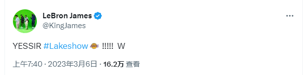 詹姆斯还发推庆祝胜利,发推写道:兄弟们太棒了,!湖人秀,赢了!