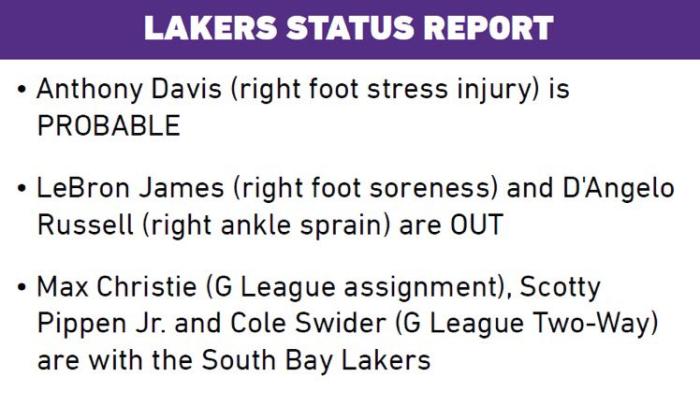 24直播网讯03月05日湖人官方公布下一场对阵勇士的伤病报告,詹姆斯(右脚酸痛)和拉塞尔(右脚踝扭伤)缺席比赛,浓眉(右脚应激伤病)大概率出战,克里斯蒂、小皮蓬和斯威德都在发展联盟,也缺席与勇士的比赛;勇士队库里、伊戈达拉预计复出,维金斯仍未归队继续缺席。