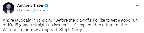 勇士官方宣布库里(左胫腓上韧带和骨间膜部分撕裂)、伊戈达拉(臀部伤势)大概率复出战湖人,勇士记者Anthony Slater表示预计库里和一哥都将在明天复出,其中伊戈达拉想要季后赛前打10-15场比赛,为季后赛做准备。