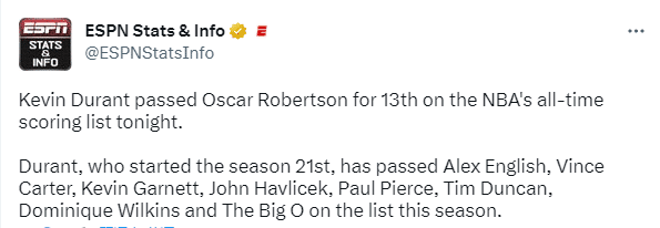 1、杜兰特常规赛总得分超越大O罗伯特森升到历史得分榜第13位,本赛季至今,杜兰特在得分榜上已经连续超越8大名宿,他们分别是亚历克斯-英格利什、文斯-卡特、凯文-加内特、约翰-哈夫利切克、保罗-皮尔斯、蒂姆-邓肯、多米尼克-威尔金斯和大O。