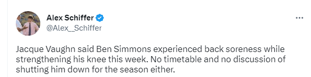 沃恩还表示目前没有西蒙斯的回归时间,球队还没有讨论关于他赛季报销的话题。